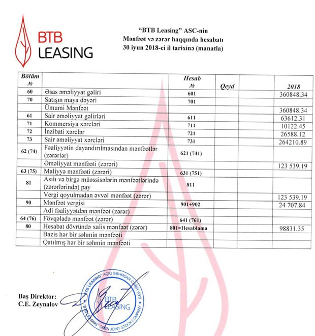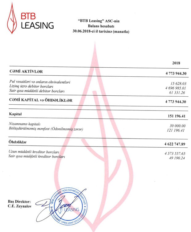 Ötən ilin 7 Sentyabr tarixində yaradılmış "BTB Leasing" ASC 2018-ci ilin birinci yarısını 98 min 831 manat xalis mənfəətlə başa vurub. ASC 2017-ci ili 22 min 365 manat xalis mənfəətlə bağlamışdı.