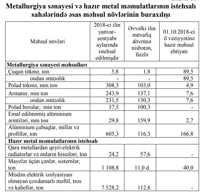 Yanvar-sentyabr ayları ərzində sahə üzrə 243,9 min ton (37,1 faiz çox) armatur, 7 528,2 ton (12,8 faiz çox) misdən elektrik izolyasiyası olmayan çoxdamarlı məftil, tros və kabellər, 605,3 ton (16,3 faiz çox) alüminium çubuqlar, millər və profillər, 1 108,8 ton (11,0 dəfə çox) mayelər üçün çənlər, sisternlər istehsal edilmişdir.