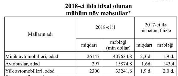 2018-ci ildə Azərbaycana 26 min 147 ədəd minik avtomobili, 2 min 300 ədəd yük avtomobili, 297 ədəd avtobus idxal olunmuşdur.