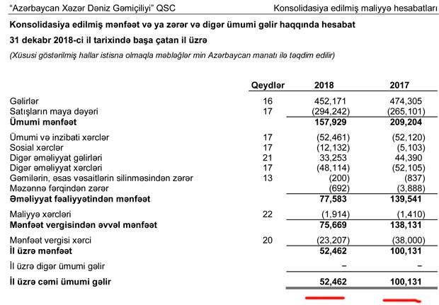 2018-ci ilin yekunları üzrə Azərbaycan Xəzər Dəniz Gəmiçiliyi (AXDG) 52,4 milyon manat (30,8 milyon dollar) xalis mənfəət əldə edib. Bu, 2017-ci ildəkindən (100,1 milyon manat) 2 dəfə azdır.