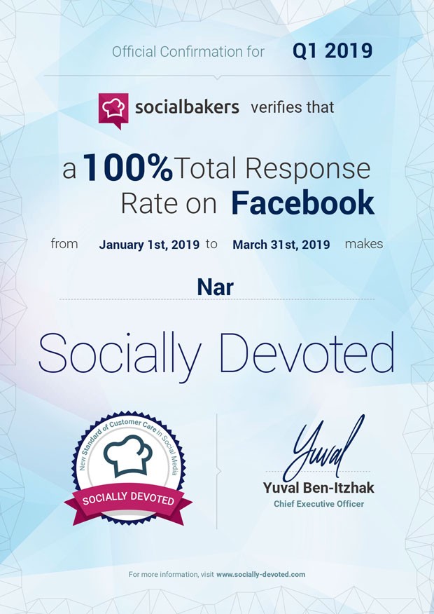 2019-cu ilin birinci rübü ərzində sosial şəbəkələrdən daxil olan müraciətlərin 25 %-dən çoxu 1 dəqiqə, 53%-ə qədəri isə 10 dəqiqə ərzində cavablandırılıb. Ümumilikdə, “Nar”-ın bütün sosial şəbəkələrindən daxil olan sorğularına ortalama 8 dəqiqə ərzində cavab verilib. Mobil operatorun üstün müştəri xidmətini nəzərə alan “Socialbakers” beynəlxalq tədqiqatı “Nar”-ın “Facebook” səhifəsini “Socially Devoted” sertifikatına layiq görüb. Belə ki, təşkilatının 2019-cu ilin birinci rübü ərzində apardığı monitorinqin nəticələrinə görə, “Nar” “Facebook” şəbəkəsinə daxil olmuş müraciətləri 100% cavablandırıb.