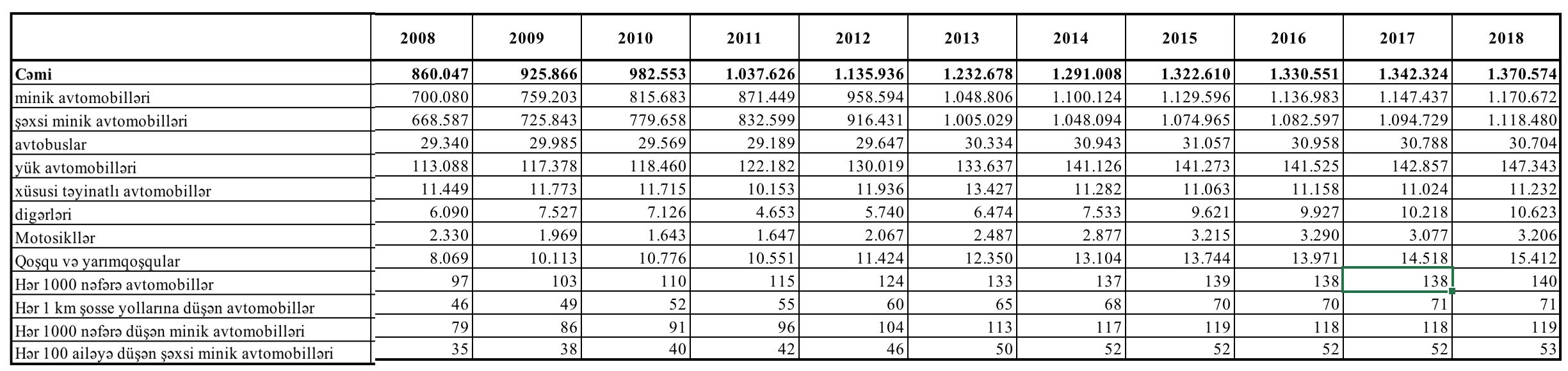 Azərbaycanda hər 1000 nəfərə 140 avtomobil, hər 1000 nəfərə 119 minik avtomobili, hər 100 ailəyə isə 53 minik avtomobili düşüb.
