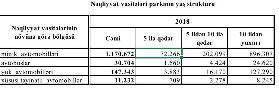 Ötən ilin sonunda minik avtomobillərinin 896 min 307 ədədinin və ya 76,5%-nin yaşı 10 ildən yuxarı olub. Cəmi 72 min 266 ədəd avtomobilin yaşı 5 ilə qədərdir. Yaşı 5-10 il civarında olan minik avtomobillərin sayı isə 202 min 99 ədəd təşkil edib.
