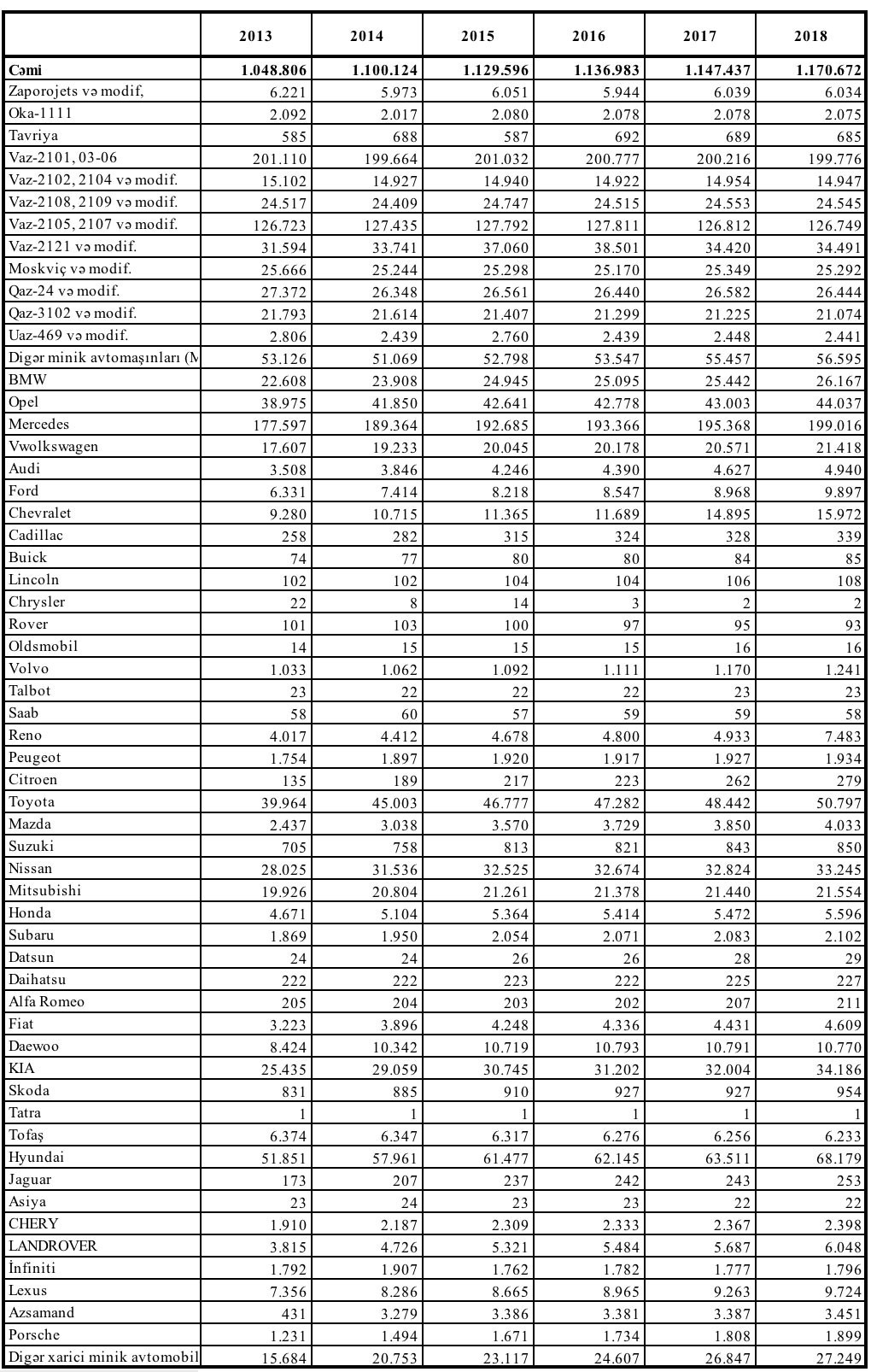Dövlət Statistika Komitəsi Azərbaycanda minik avtomobillərinin strukturunu açıqlayıb. "Mercedes"lərin sayı (199 016 ədəd), nəhayət, VAZ 2101, 2103 və 2106-ya çatıb. Amma "Hyundai" ötən il alınan avtomobillərin sayında lider olub.