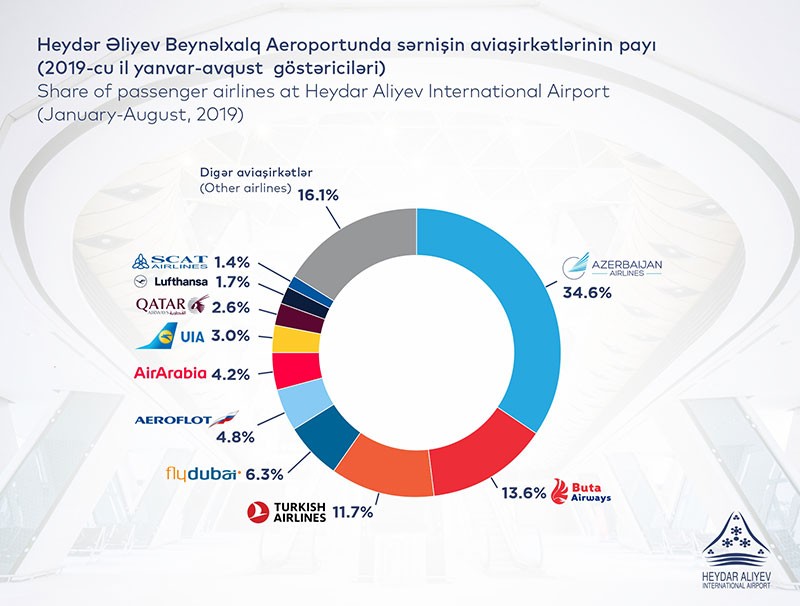 "Marja" Heydər Əliyev Beynəlxalq Aeroportuna istinadən xəbər verir ki, populyar aviaşirkətlərin onluğuna AZAL (Azərbaycan, 969 min), "Buta Airways" (Azərbaycan, 381 min), Türk Hava Yolları (Türkiyə, 329 min sərnişin), “FlyDubai” (BƏƏ, 178 min), “Aeroflot” (Rusiya, 134 min), “AirArabia” (BƏƏ, 117 min), “UIA” (Ukrayna, 83 min), “Qatar Airways” (Qətər, 74 min), “Lufthansa” (Almaniya, 46 min) və “SCAT” (Qazaxıstan, 40 min) daxildir.