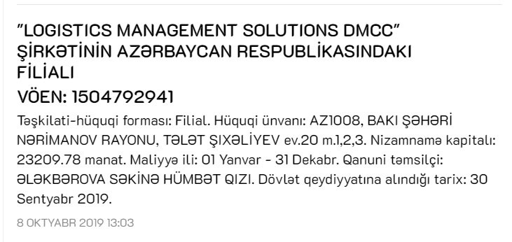 "Marja" xəbər verir ki, Şirkət 30 sentyabr 2019-cu il tarixində Vergilər Nazirliyində dövlət qeydiyyatından keçib. Şirkətin nizamnamə kapitalı 23 min 209 manat təşkil edir.