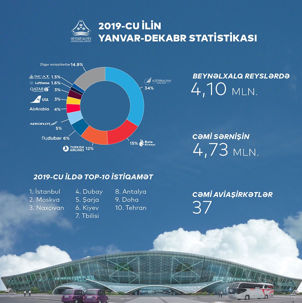 2019-cu il ərzində Heydər Əliyev Beynəlxalq Aeroportundan 37 sərnişin aviaşirkəti 60-dan çox müxtəlif istiqamətə uçuşlar həyata keçirmişdir.