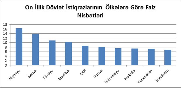 Bu minvalda dünyada ən yüksək faizli 10 illik dövlət istiqrazı buraxan ölkə 16.27% ilə Nigeriyadır. İki və üçüncü yerlərdə Kenya və Türkiyə qərarlaşıb. Bu ölkələrdə istiqrazlardan əldə edilən illik qazanc payları müvafiq olaraq 13.84% və 11.03% təşkil edir.