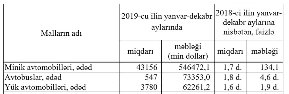 2019-cu ildə Azərbaycana bəyan edilmiş ümumi dəyəri 546,4 milyon dollar olan 43 min 156 ədəd minik avtomobil idxal edilib.