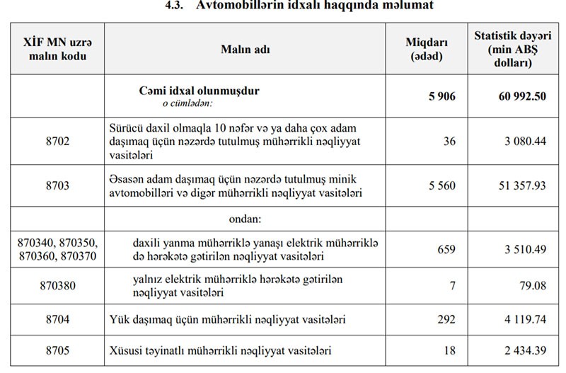 2020-ci ilin Yanvar ayında Azərbaycana daxili yanma mühərriklə yanaşı elektrik mühərriklə də hərəkətə gətirilən 659 ədəd nəqliyyat vasitəsi (hibrit avtomobil) idxal edilib. İdxala 3 milyon 510 min dollar xərclənib.