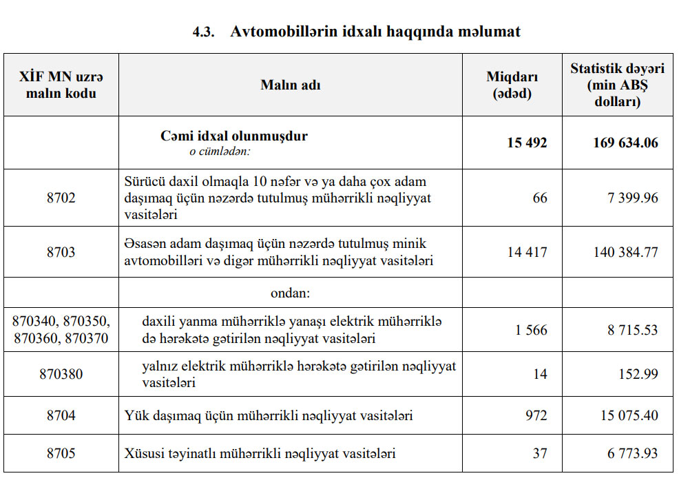 İlk 3 ayda ölkəmizə 14 min 417 ədəd minik avtomobili, 66 ədəd avtobus, 972 ədəd yük avtomobili və 37 ədəd xüsusi təyinatlı avtomobil idxal edilib.