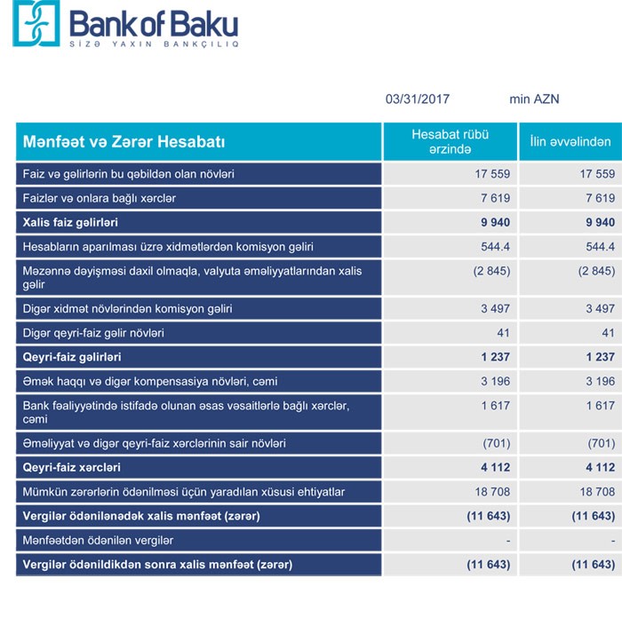 Bankın açıqldığı maliyyə hesabatlarından məlum olur ki, 2017-ci ilin yanvar-mart aylarında Bank of Bakunun cəmi gəlirləri 18 milyon 796 min manat təşkil edib. Bank ehtiyatların yaradılmasına 18 milyon 708 min manat nəzərdə tutduğundan ilk rüb 11 milyon 643 min manat zərər ilə başa vurulub.