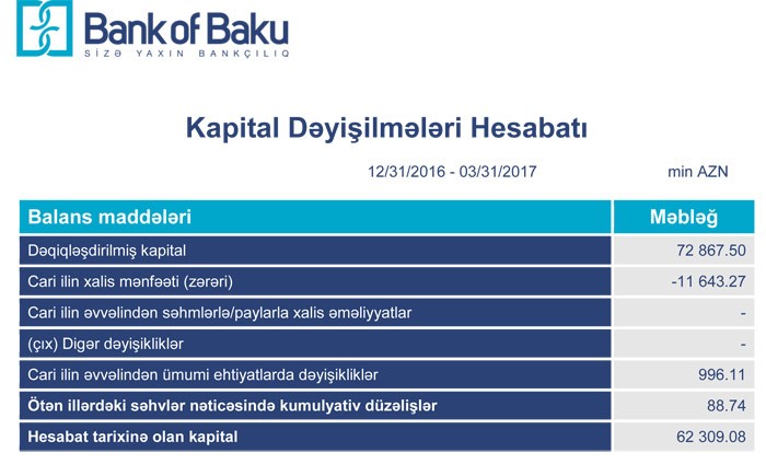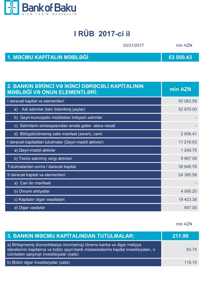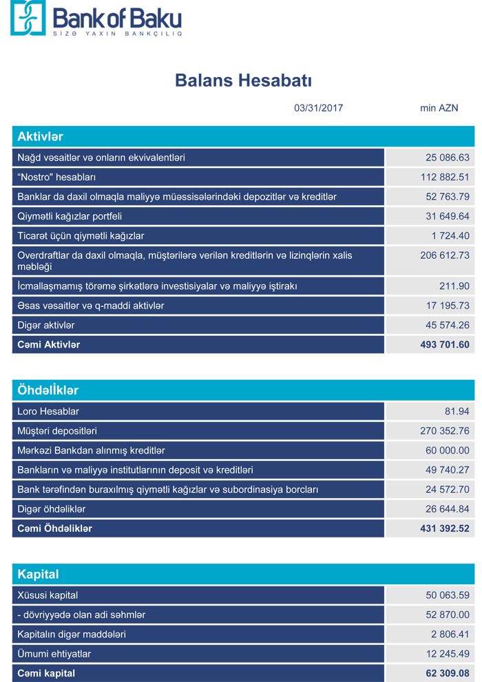 31 Mart 2017-ci il tarixinə Bank of Baku 493 milyon 701 min manat cəmi aktivlərə, 431 milyon 392 min manat cəmi öhdəliklərə, 62 milyon 309 min manat cəmi öhdəliklərə malik olub. Ötən ilin sonunda Bank 549 milyon 609 min manat cəmi aktivlərə, 476 milyon 741 min manat cəmi öhdəliklərə, 72 milyon 867 min manat cəmi kapitala malik idi.