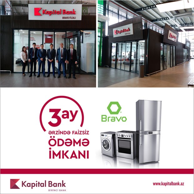 Kapital Bank həmçinin yeni filialda Bravo marketlə birgə müştərilərə kredit aksiyası təqdim edir. Şərtlərə görə hiper marketdə məişət texnikası əldə edən müştərilər ilk 3 ay ərzində faizsiz ödəmə imkanı əldə edirlər. Bu aksiyadan bütün müştərilər faydalana bilər. Kredit 12 ay müddətə rəsmiləşdirilir.