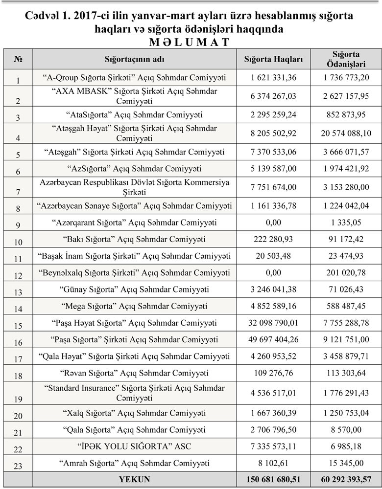 2017-ci ilin ilk rübü ərzində sığorta şirkətləri tərəfindən toplanmış sığorta haqlarının həcmi 150 milyon 681 min manat, ödənişlərisə 60 milyon 292 min manat təşkil edib. Bu barədə "Marja"ya Mailyyə Bazarlarına Nəzrət Palatasından bldirilib.