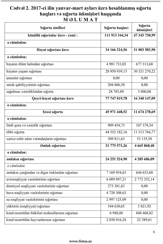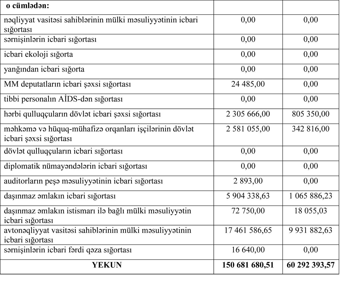 Qeyd edək ki, 2016-cı ilin ilk rübü ərzində sığorta şirkətləri tərəfindən 152 milyon 394 min manat sığorta haqları hesablanmış, 52 milyon 578 min manat ödənişlər həyata keçirilmişdi. Beləliklə, sığortada yığımlar azalır, ödənişlər artır.