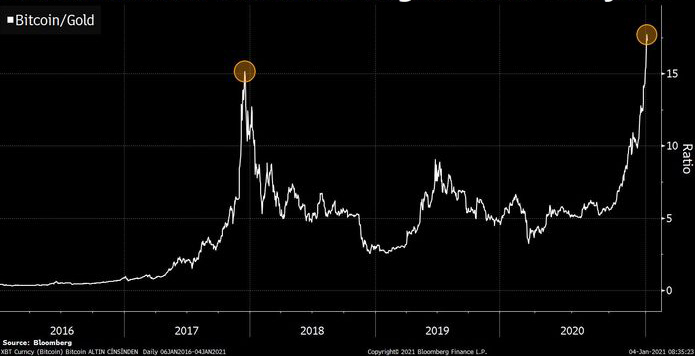 2020-ci il başlarkən Bitcoin az qala 5 unsiya (141 qram) qızılın dəyərilə ekvivalent idi. Bitcoin 2020-ci ilə 7 min 500 dollar səviyyəsində başlayıb 310% bir artımla 30 min dollar səviyyəsinə qədər çatıb, qızıl isə 1550 dollar səviyyəsindən başlayıb 24% artımla 1900 dollar səviyyəsindən bağlanıb.
