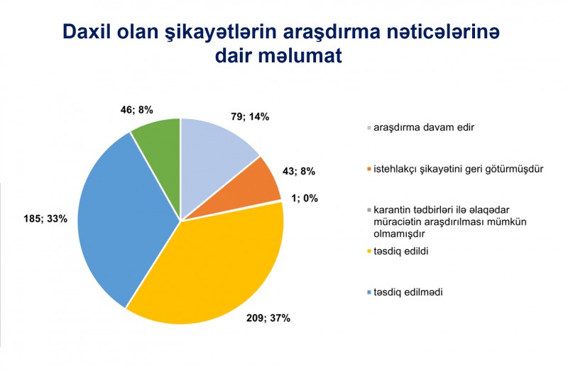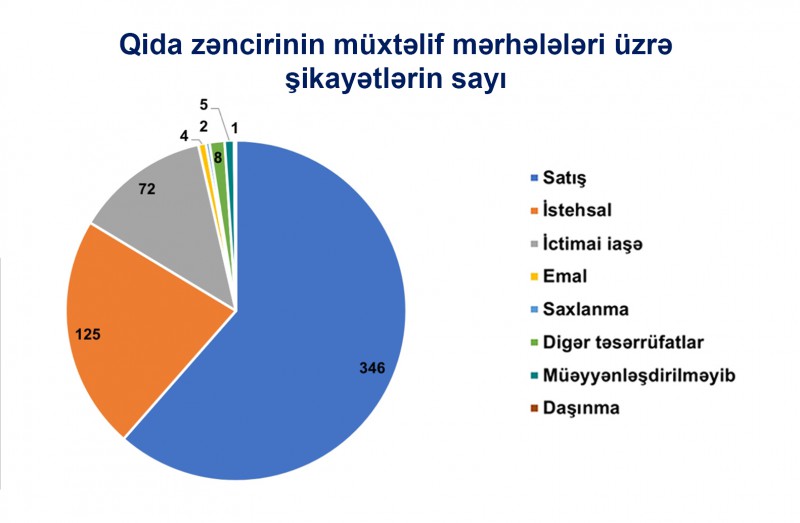 İlk beş ay ərzində daxil olan müraciətlərin qida zəncirinin müxtəlif mərhələləri üzrə təsnifatına əsasən satışla bağlı şikayətlərin sayı üstünlük təşkil edib. Qida zəncirinin daşınma və saxlanma mərhələsi üzrə isə daha az sayda şikayət daxil olub. İstehlakçı hüquqlarının pozulması ilə bağlı daxil olan şikayətlərin araşdırılması nəticəsində 209 şikayət öz təsdiqini tapıb və agentlik tərəfindən qanunvericiliyə əsasən müvafiq tədbirlər görülüb. 185 müraciətdə göstərilən fakt öz təsdiqini tapmayıb.