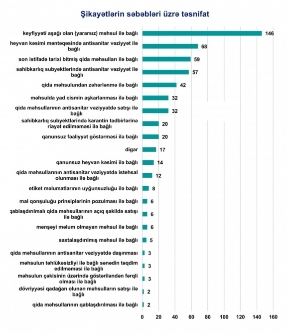 Daxil olan müraciətlər arasında ən çox sayda şikayət məhsulun keyfiyyətinin aşağı olması ilə (146) əlaqədardır. Heyvan kəsimi məntəqəsində (68) və sahibkarlıq subyektlərində antisanitar vəziyyət (57), eyni zamanda son istifadə tarixi bitmiş qida məhsulları (59) ilə əlaqədar şikayətlərin sayı da digər məzmunlu şikayətlərlə müqayisədə çoxluq təşkil edib. Ən az şikayət məhsulların çəkisinin qablaşdırmada göstərilən çəkidən fərqli olması (kəmiyyət saxtalaşdırılması) və qablaşdırılması, eyni zamanda dövriyyəsi qadağan olunmuş məhsulların satışı ilə əlaqədar olub.