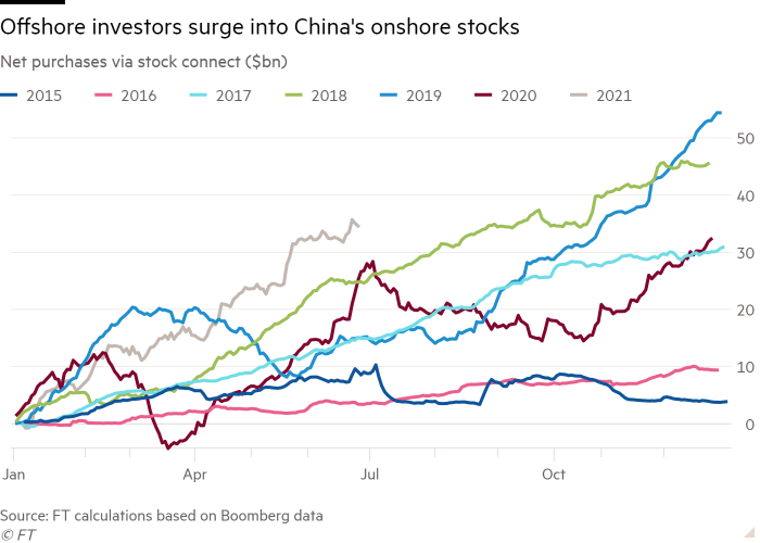 Bloombergin hesablamalarına görə, təkcə bu ilin əvvəlindən iyunun sonuna kimi ofşor investorlar Honkonq, Şanxay və Şenzen birjaları vasitəsilə Çin şirkətlərinin 35 milyard dollardan artıq səhmlərini alıb. Bu isə ötən ilki göstəricidən 49% çoxdur.