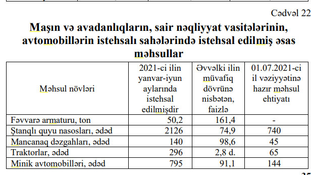 Xatırladaq ki, 2020-ci ildə Azərbaycanda 1949 ədəd və ya 2019-cu illə müqayisədə 411 ədəd az minik avtomobili, 300 ədəd və ya 2019-cu illə müqayisədə 66.9% az traktor istehsal edilmişdi.
