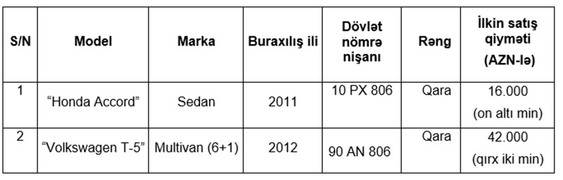 İcbari Sığorta Bürosuna məxsus 2 ədəd avtomobil hərrac yolu ilə satışa çıxarılacaq.