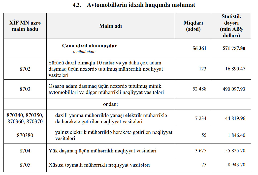 Qeyd edək ki, 2020-ci ilin yanvar-avqust aylarında Azərbaycana 399 milyon 498 min dollar dəyərində 33 min 178 ədəd avtomobil idxal edilmişdi.
