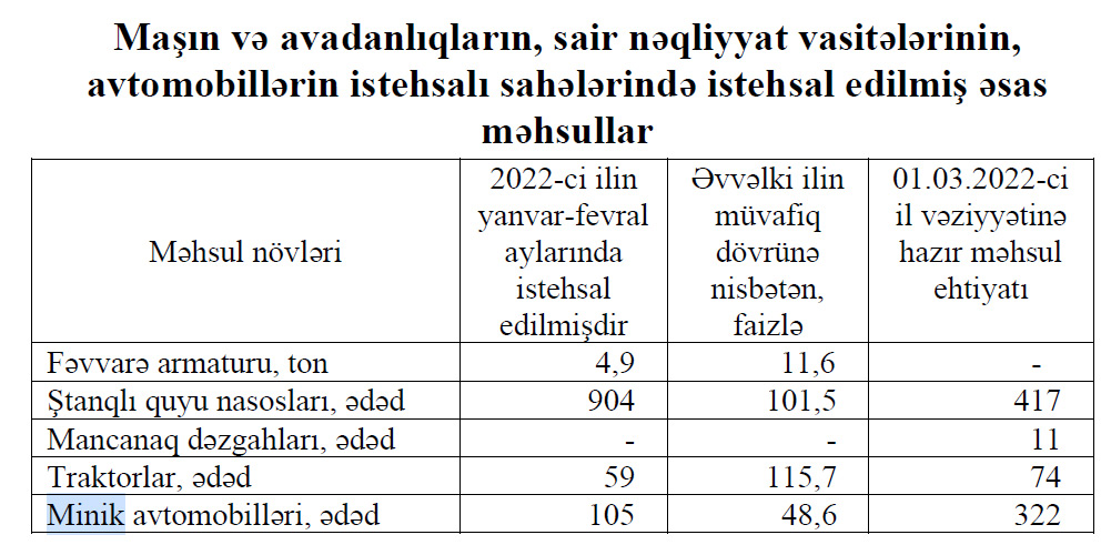 Fevralda Azərbaycanda cəmi 3 ədəd minik avtomobili istehsal edilib.2022-ci ilin yanvar-fevral aylarında Azərbaycanda 105 ədəd və ya ötən ilin müvafiq dövrü ilə müqayisədə 111 ədəd (51,4% az) az minik avtomobili istehsal olunub.