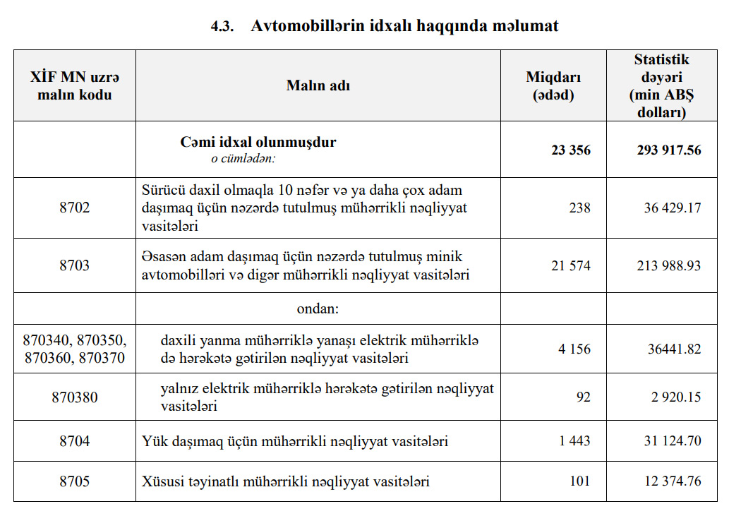 2022-ci ilin ilk 4 ayında (yanvar-aprel) Azərbaycana 293 milyon 917 min dollar dəyərində 23 min 356 ədəd nəqliyyat vasitəsi (avtomobi) idxal edilib.