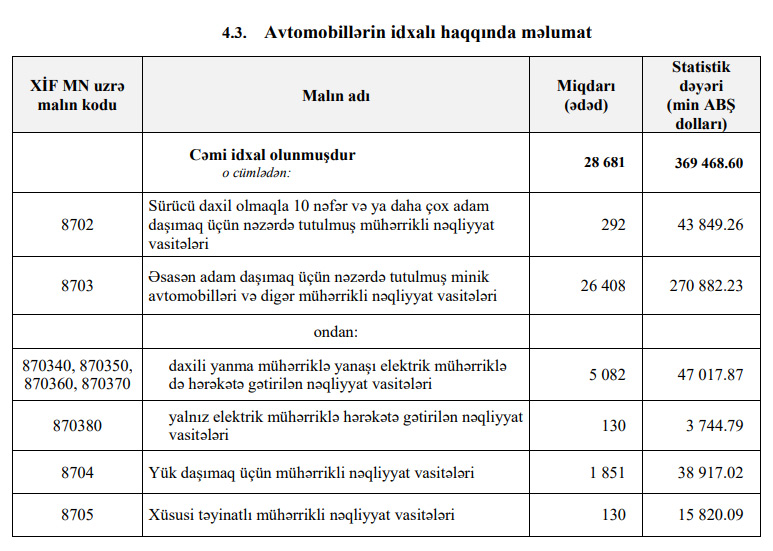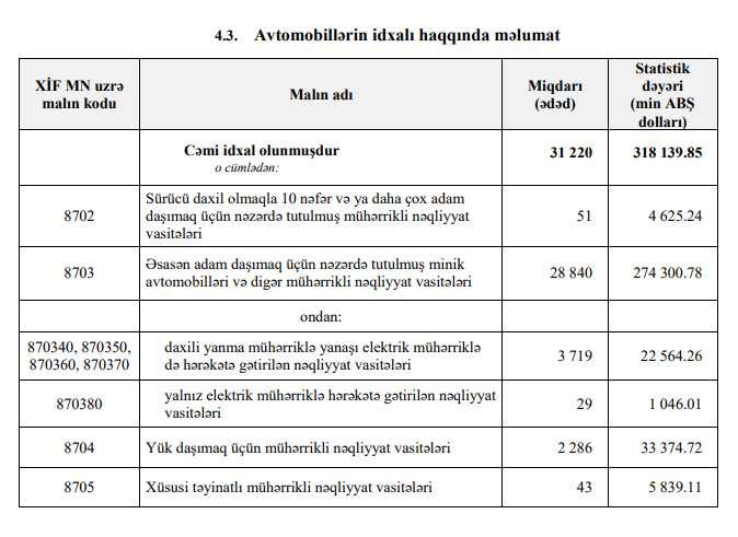 Qeyd edək ki, 2021-ci ilin ilk 5 ayında Azərbaycana 318 milyon 139 min dollar dəyərində 31 min 220 ədəd nəqliyyat vasitəsi (avtomobi) idxal edilmişdi.