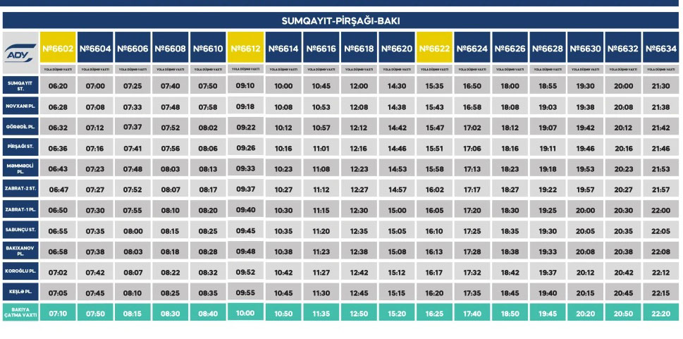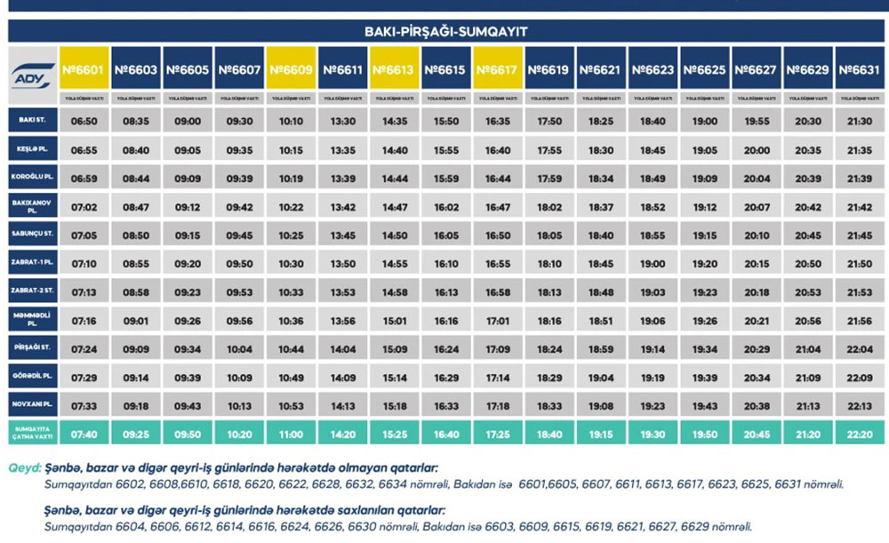 Azərbaycan Dəmir Yollarının yaydığı məlumatda bildirilir ki, sentyabrın 3-ü saat 09:00-dan, sentyabrın 8-i saat 19:00-dək Bakı-Pirşağı-Sumqayıt-Bakı, eləcə də Bakı-Xırdalan-Sumqayıt-Bakı şəhərətrafı sürət elektrik qatarlarının hərəkət cədvəlində bəzi reyslərin vaxtı yeni qrafiklə olacaq.