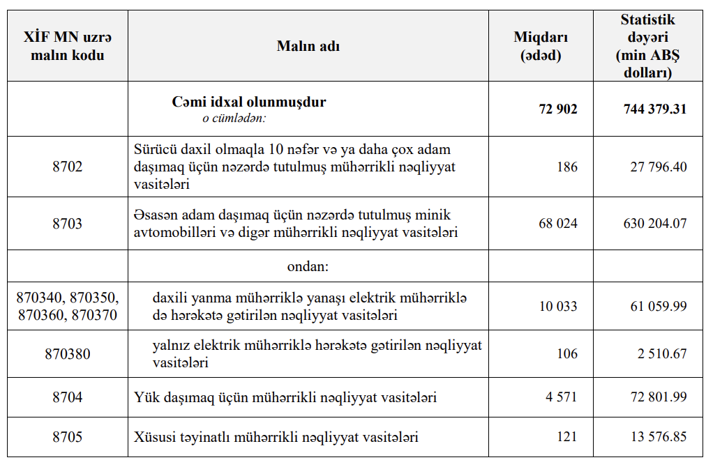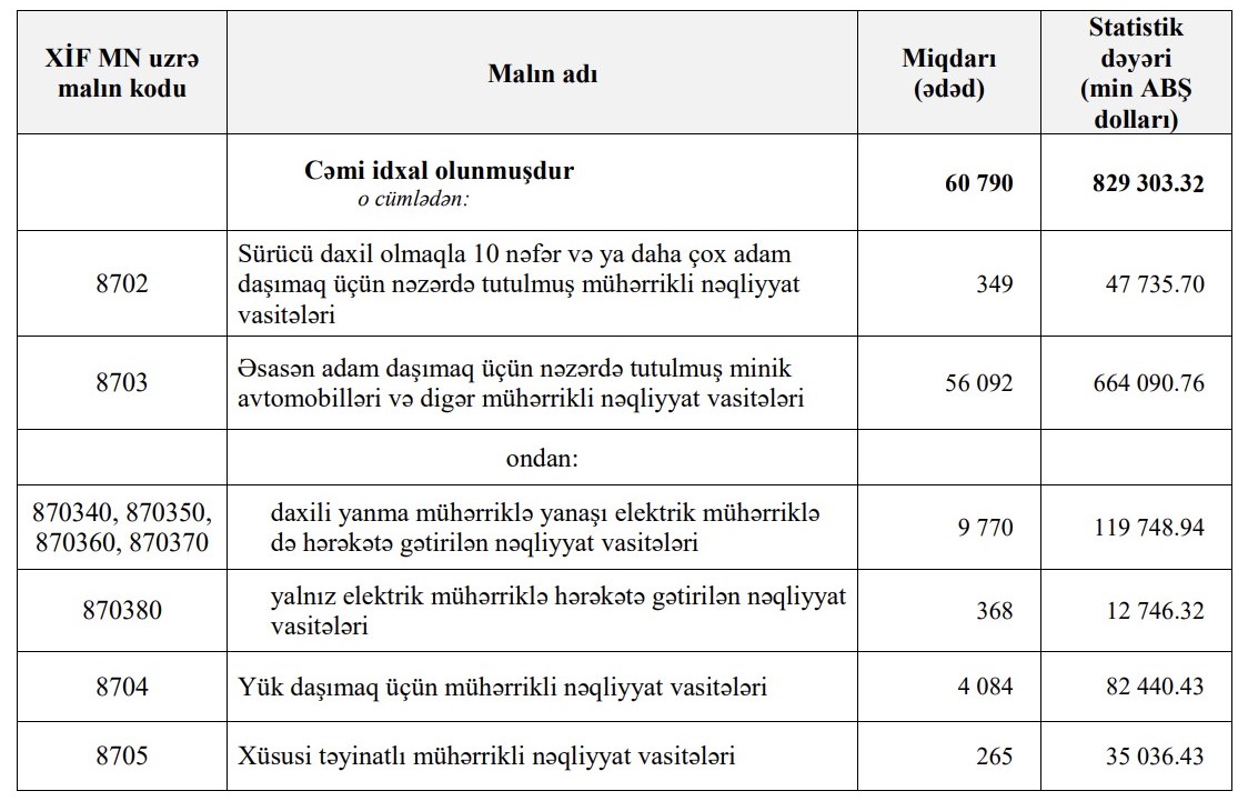 Azərbaycana 84 milyon dollar daha çox vəsaitə 12 min ədəd daha az avtomobil gətirilib.2022-ci ilin 10 ayı ərzində (yanvar-oktyabr) Azərbaycana 829 milyon 303 min dollar dəyərində 60 min 790 ədəd nəqliyyat vasitəsi idxal edilib.