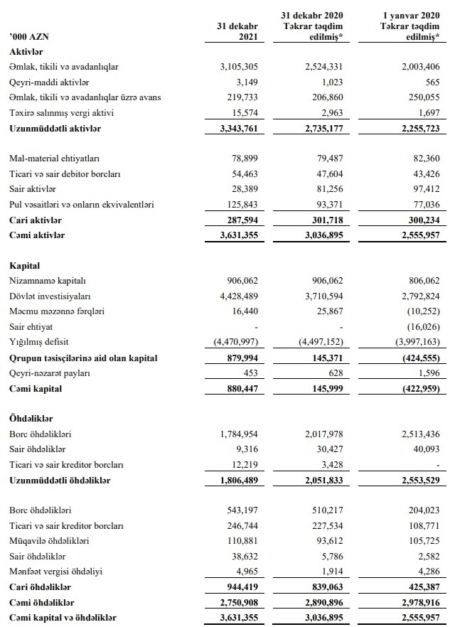 31 dekabr 2021-ci il tarixində “Azərbaycan Dəmir Yolları” QSC 3 milyard 631 milyon 355 min manat cəmi aktivlərə malik olub (31 dekabr 2020-də 3 milyard 36 milyon 895 min manat).