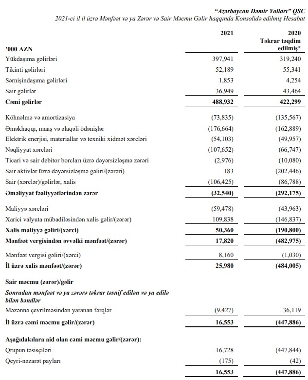 "Azərbaycan Dəmir Yolları" QSC 2021-ci ili 25 milyon 980 min manat xalis mənfəət ilə başa vurub. Dövlət şirkəti 2020-ci ili 484 milyon 5 min manat xalis zərər ilə bağlamışdı.