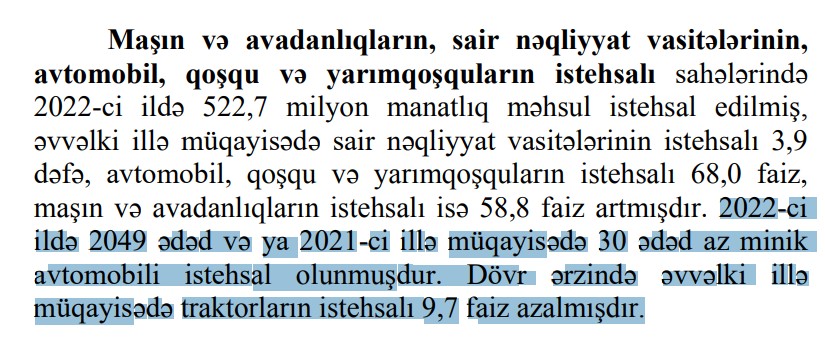 Xatırladaq ki, Dövlət Statistika Komitəsi 2021-ci il üzrə illik hesabatında, Azərbaycanda 2043 ədəd minik avtomobili istehsal olunduğunu açıqlamışdı. Komitə son hesabatında 2021-ci ildə 2 079 ədəd minik avtomobili istehsal edildiyinə işarə edib.