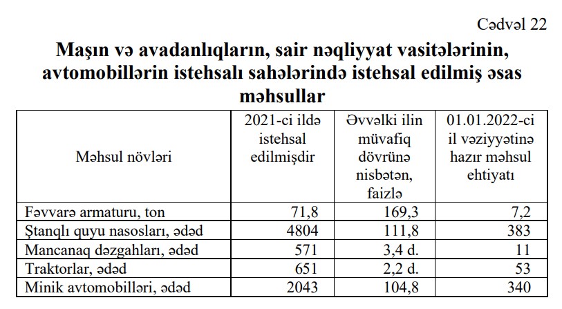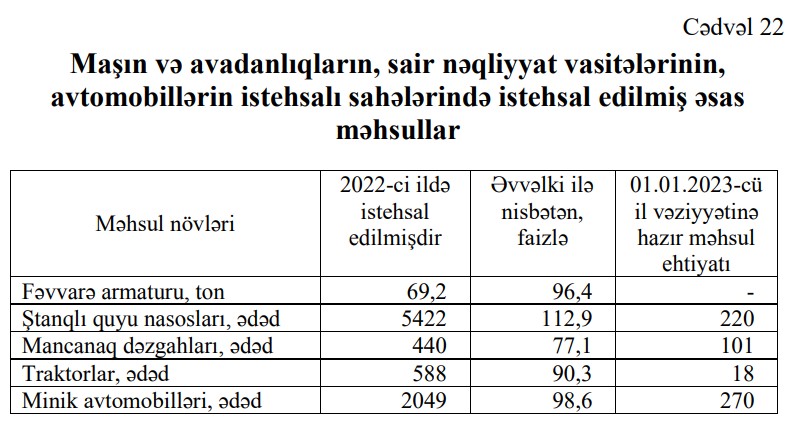 2022-ci ildə Azərbaycanda 2049 ədəd və ya 2021-ci illə müqayisədə 30 ədəd (-1,4%) az minik avtomobili istehsal olunub (yığılıb).