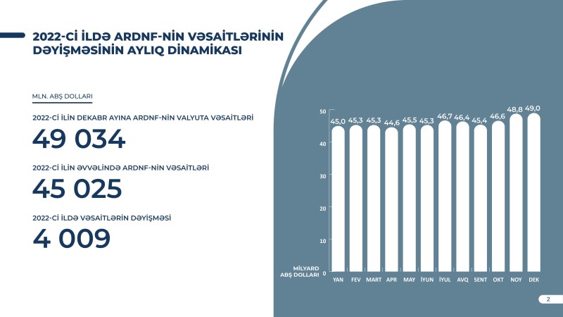 2022-ci il dekabrın 31-ə Azərbaycan Respublikası Dövlət Neft Fondunun (ARDNF) aktivləri 2022-ci ilin əvvəlinə nisbətən 8.9% və ya 4 milyard 8,5 milyin dollar artaraq 49 milyard 33,6 milyon ABŞ dolları təşkil edib. 2022-ci ilin əvvəlində ARDNF 45 milyard 25,1 milyon ABŞ dolları aktivlərə malik idi. Aktivlərin artması neft və qaz sazişlərinin həyata keçirilməsi üzrə gəlirlər ilə bağlıdır.