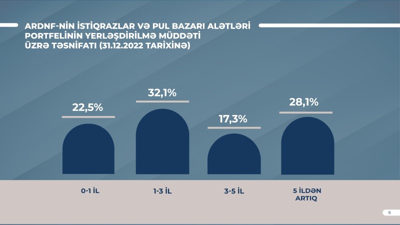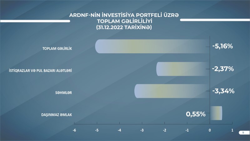 2022-ci ildə ARDNF istiqrazlar və pul bazarları alətləri üzrə 2,37%, səhmlər üzrə 3,34% zərər edib, daşınmaz əmlak investisiyaları üzrə 0,55% gəlir əldə edib.