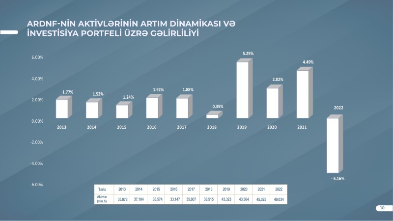 Marja.az ADRNF-nin 2022-ci il üzrə investisiya fəaliyyətinin yekunlarına istinadən xəbər verir ki, ötən il Fond investisiya portfeli üzrə 5,16% zərər edib. 2021-ci ildə ARDNF-in investisiya portfeli üzrə gəlirliliyi 4,49% təşkil etmişdi. Son 10 ildə ən böyük nisbətdə gəlirlilik 2019-cu ildə 5,29% olaraq qeydə alınmışdı.