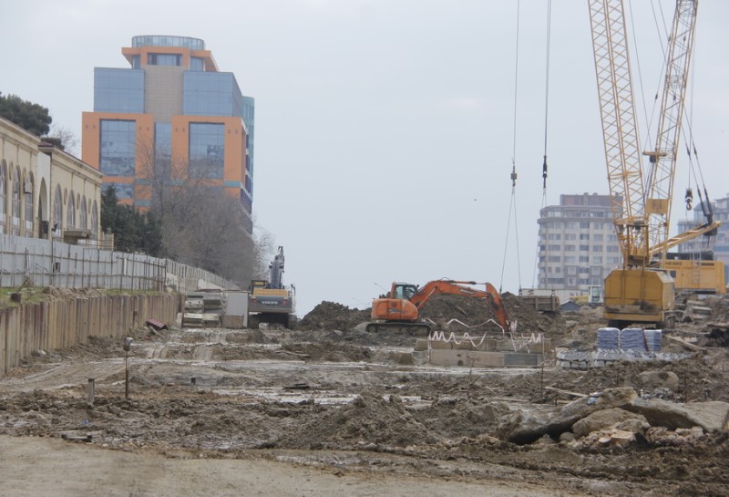 Tikinti işləri dərin və ensiz xəndəklərin qarşı-qarşıya qazılmasından başlanıb. Xəndəklərin divarları bentonit məhlulu ilə emal olunmaqla möhkəmlənib, uçqun təhlükəsi aradan qaldırılıb. Sonradan bu xəndəklərə dəmir-beton panellərin metal konstruksiyaları yerləşdirilib və xəndəklər beton məhlulu ilə doldurulub. İki divar arasında qalan sahədə qruntçıxarma işləri aparılıb ki, bu da əvvəlki üsullarla müqayisədə daha az vaxt aparır və daha ucuz başa gəlir.