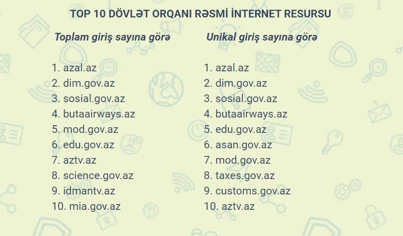 Toplam giriş sayına görə 5-ci yerdə Müdafiə Nazirliyinin mod.gov.az, 6-cı sırada Elm və Təhsil Nazirliyinin edu.gov.az, 7-ci pillədə “Azərbaycan Televiziya və Radio Verilişləri” QSC-nin (AzTV) aztv.az saytı yerləşib.