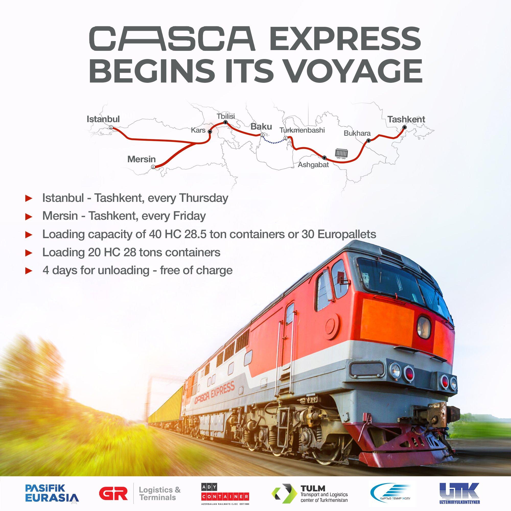 "Azərbaycan Dəmir Yolları" QSC-nin (ADY) törəmə şirkəti “ADY Konteyner” MMC İstanbul-Daşkənd və Mersin-Daşkənd marşrutu üzrə "CASCA EXPRESS" konteyner blok qatarı ilə yükdaşımalara başlayır.